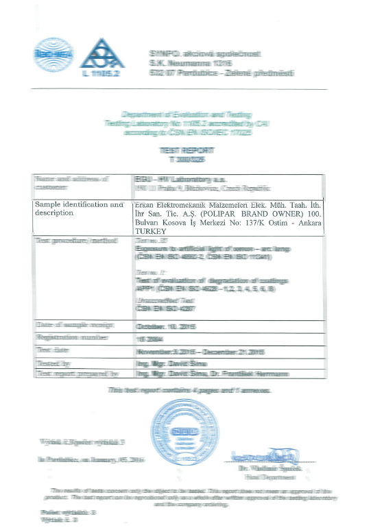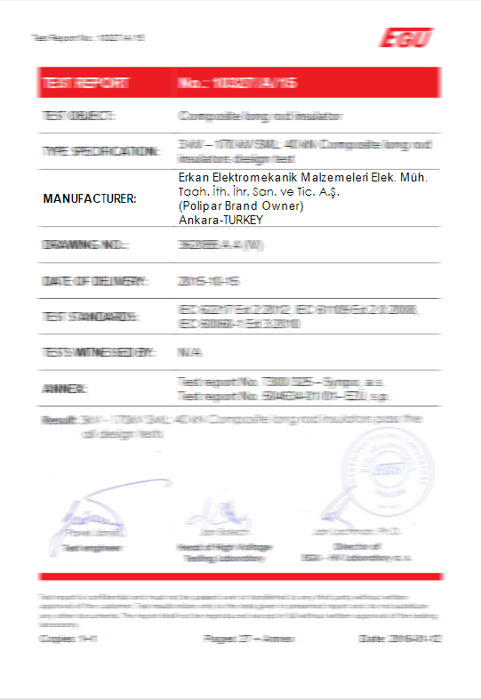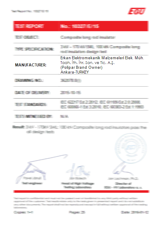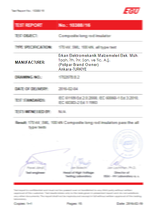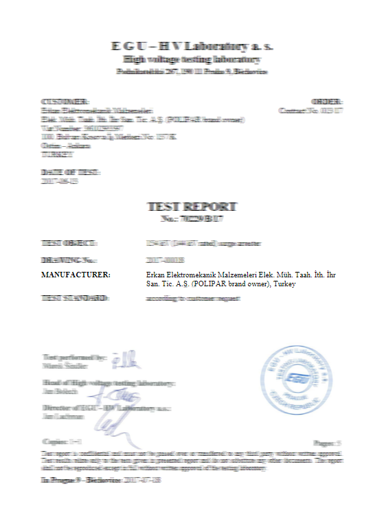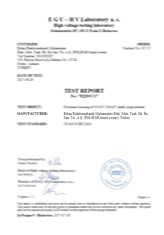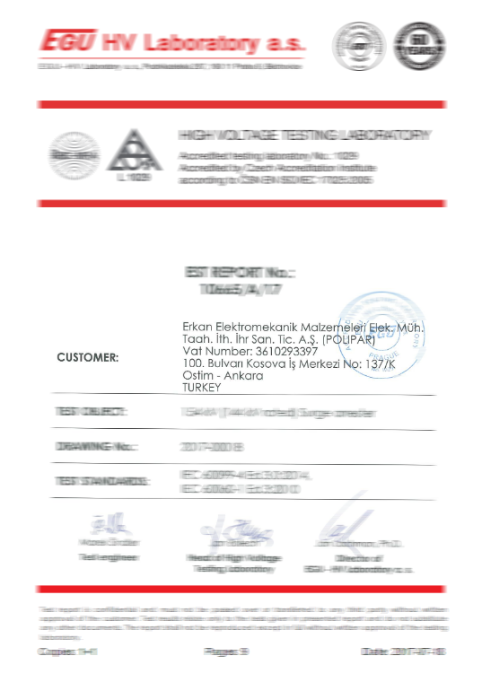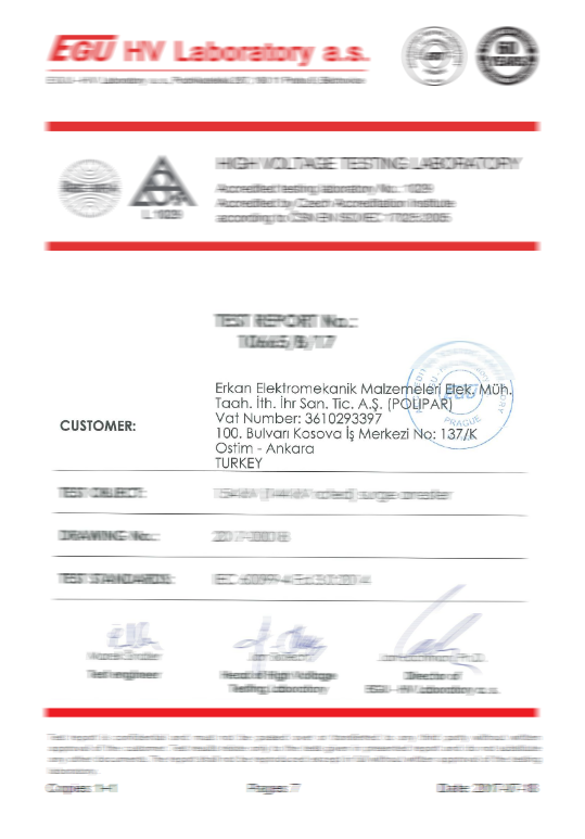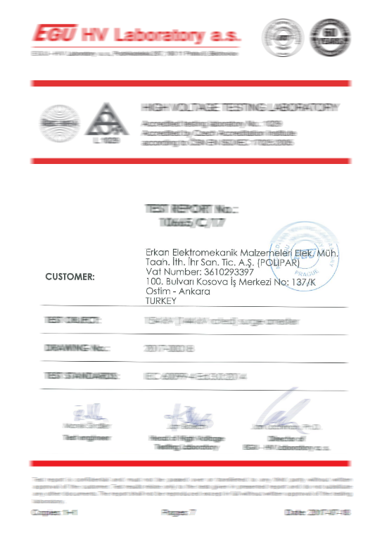 Surge arresters in accordance with TS-EN 60099-4, IEC 99-4, IEC 60, IEC 270 and IEC TC 37 standards within the TSE and ISO 9001 Quality Management System, our polymer (composite) chain insulators IEC 61109 and IEC 62217 In accordance with the standards, our installation type products are manufactured in accordance with TS EN 61643-11. In addition, our connector lugs and terminals are certified with TS EN 61238-1 standard. In this way, our company is based on both domestic and international standards in production norms.